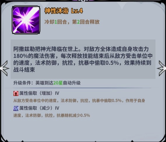 阿撒兹勒把神光降临在世上。对敌方全体造成自身攻击力180%的魔法伤害,每次释放技能结束后从敌方受击单位中的速度,法术防御,抗控,抗暴中偷取0.5%,效果持续到战斗结束