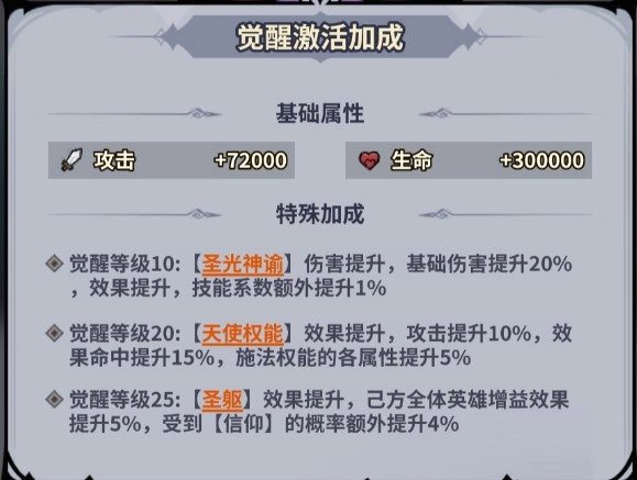 觉醒等级25:【圣躯】效果提升,已方全体英雄增益效果提升5%,受到【信仰】的概率额外提升4%