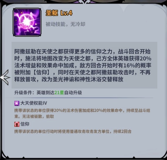 阿撒兹勒在天使之都获得更多的信仰之力,战斗回合开始时,施法将地图改变为天使之都,已方全体英雄获得20%法术增益和效果命中加成,敌方回合开始时有16%的概率被附加【信仰】,同时在天使之都阿撒兹勒攻击时,不再释放普攻,改为圣光神谕和神性沐浴交替释放