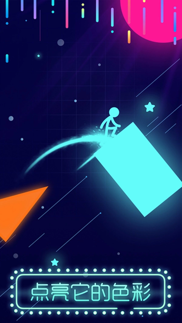3、点亮它的彩色是火柴人类型的快速跳跃和突破。控制角色快速移动和前后跳跃点亮世界中的各种灯光,
