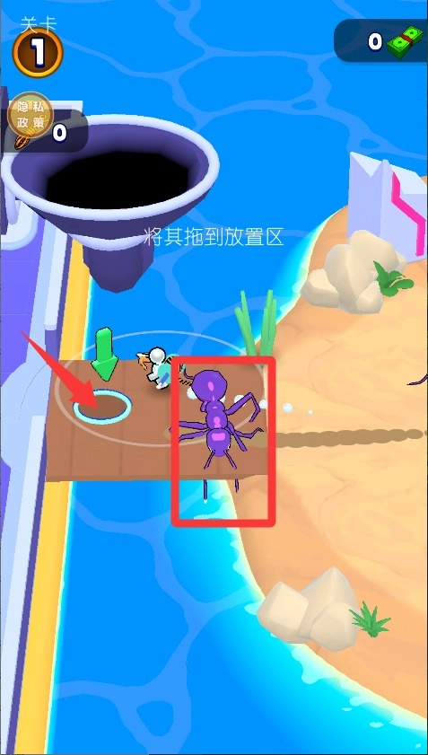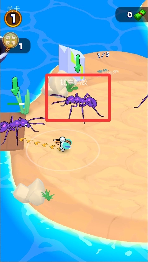 1、用左手在屏幕上滑动来操控角色移动,要缓缓接近目标,避免惊动它;由于蚂蚁体型很小,必须凑近到足够近的距离才能抓住。