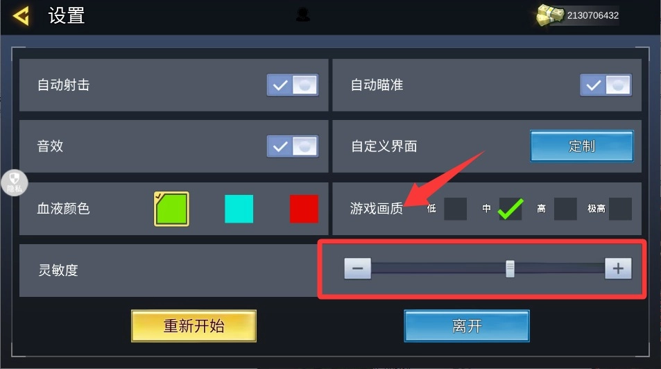 2、进入设置界面调整操作灵敏度和画质效果,建议新手选择中等灵敏度以便更快适应射击手感。