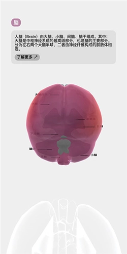 7、再次点击该器官,会显示它的具体说明信息,并在模型中标注出器官构成,点击下方的了解更多按钮,同样会进行浏览器跳转。