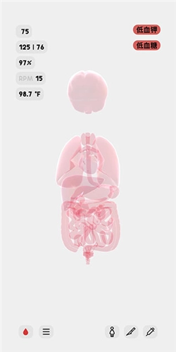 8、屏幕右上角显示的是该人体模型的异常状态,例如现在,她正处于低血钾和低血糖的状态中。