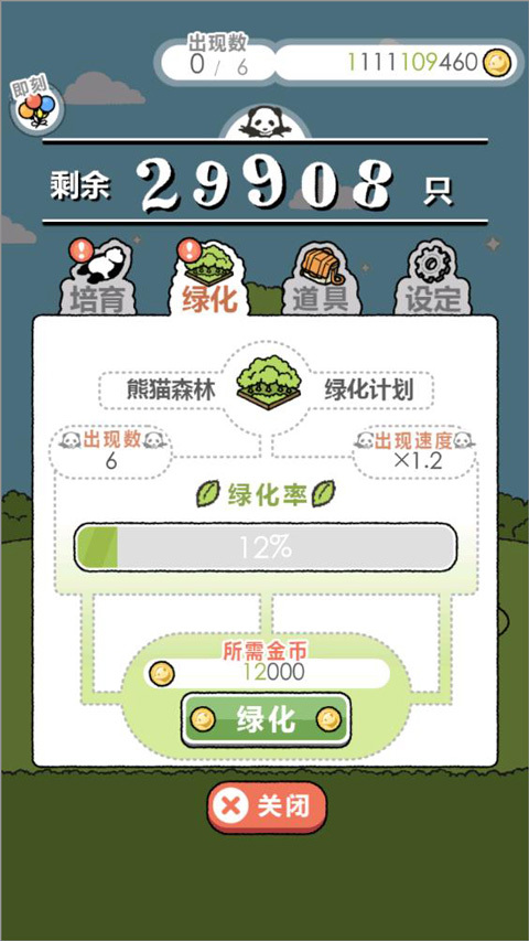 2、利用收集到的熊猫资源解锁新品种,提高绿化率,扩建森林;
