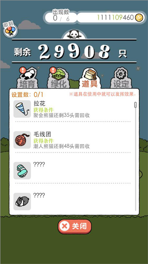 通过解锁培养各种新颖的熊猫来获得道具,例如拉花、毛线团等等。