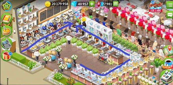 在我的咖啡馆中,这算是目前自己做过的布局里面效率最高的一款,因为这个布局的小费收益还算不错,同时兼具美观和好看。但因为有点缺钱还有很多可以替换的,不过布局不会调整。低级别的时候也可以参考,就是家具不一样而已。后面再分析为什么说这是一个高效率布局: