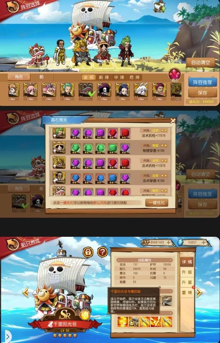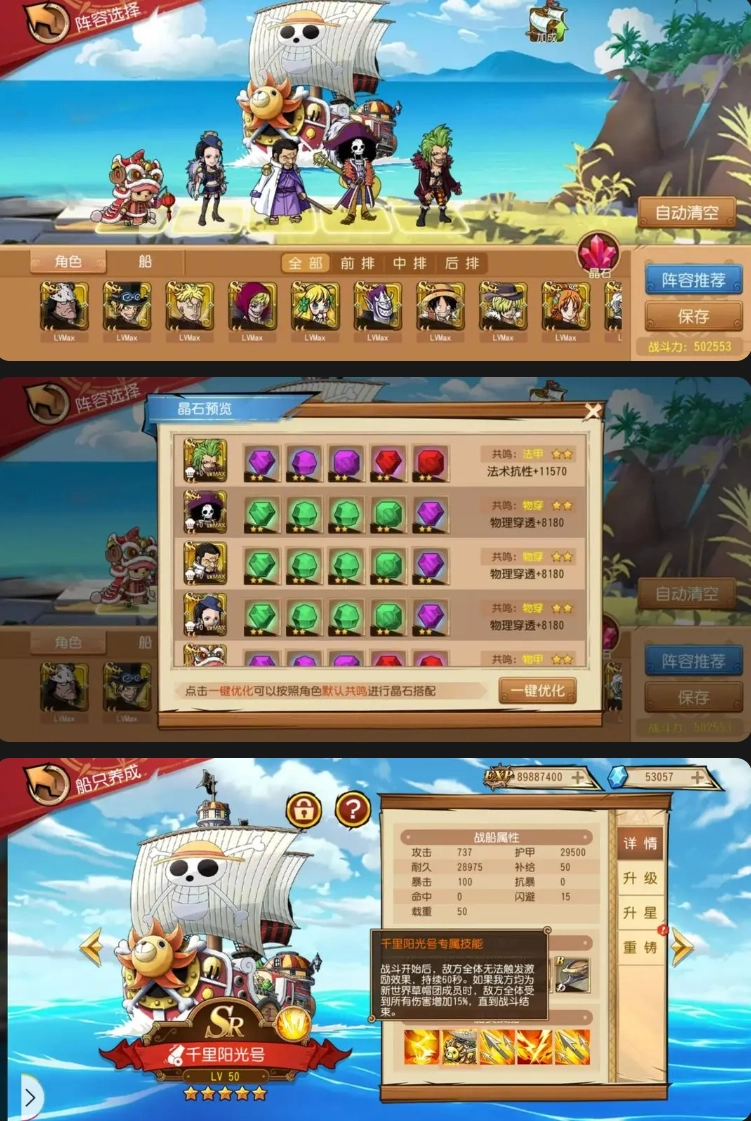 1、主流最佳阵容:突破新世界·乔巴(物甲)+突破新世界·罗宾(物穿)+藤虎(物穿)+突破新世界·布鲁克(物穿)+巴尔托洛梅奥(法甲)【船技:千里阳光号】