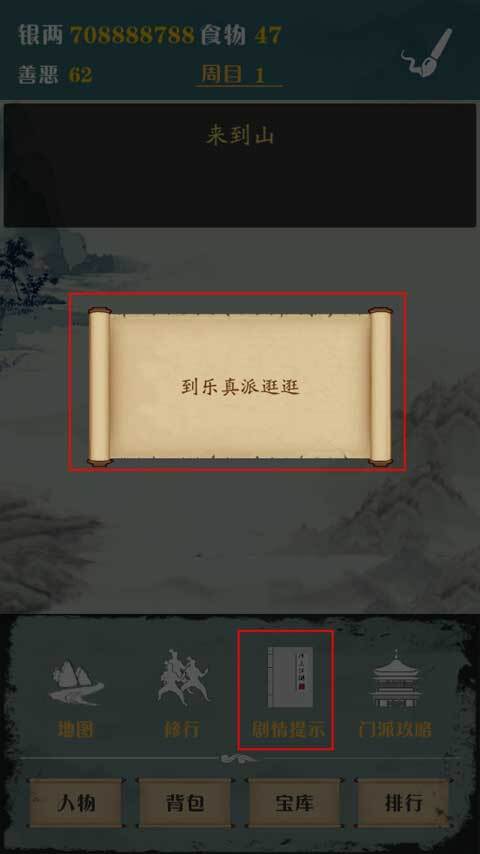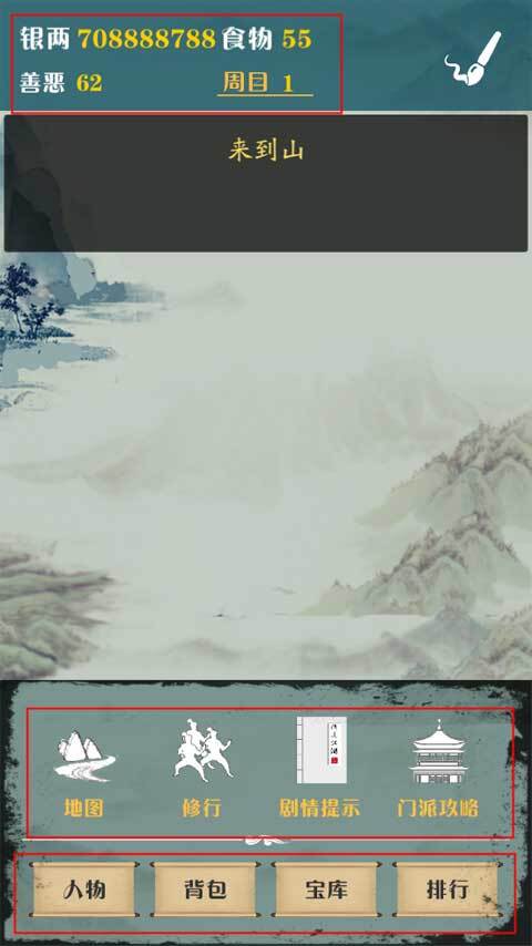 主要分为三个部分:上方的银两、食物、善恶与剧情点为第一部分;下方的地图、修行、剧情提示及门派攻略为第二部分;人物、背包、宝库和排行则是第三部分。接下来开始介绍: