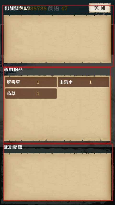 背包内的物品主要包含出战背包、备用物品和武功秘籍这三类,它们都得通过触发剧情点或者和NPC对话的方式来获取。