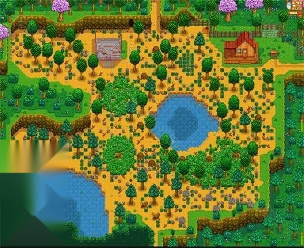 地图地块面积很大,且除正下方与右边的两个池塘以外大部分都是可耕地,是种植农作物和饲养动物的理想选择。
