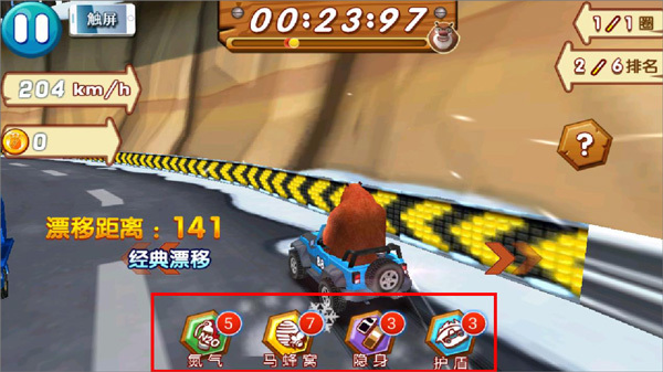4、在中玩家可使用道具帮助自己通关,道具有氮气、马蜂窝、护盾、隐身功能等。