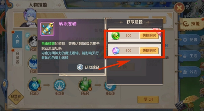 “转职卷轴”是角色转职的必备道具,购买方式有两种,分别是活力购买和钻石购买。