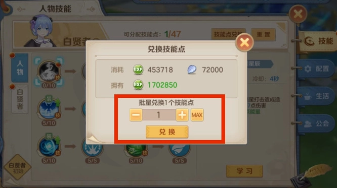 ②只需要消耗一定的经验和银币即可兑换需要的技能点。
