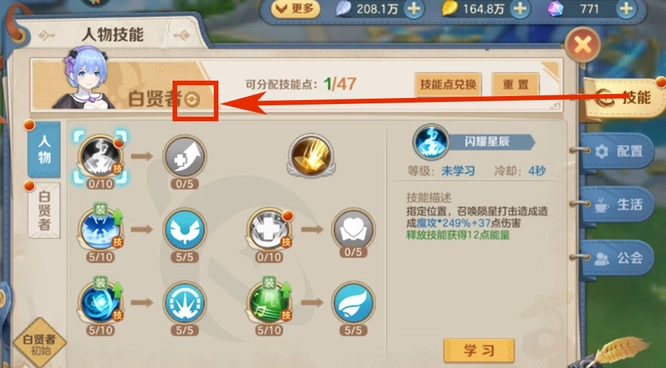 ①前述条件全部完成之后,进入需要转职的角色技能界面,点击该角色职业名右侧的小圆圈。