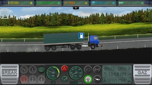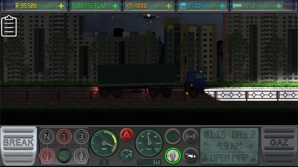5、点击第五个按钮会正式驾驶卡车上路,行驶过程中点击右边的按钮是前进,左边的是刹车。