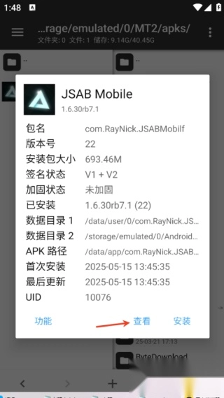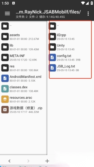 6、接着在右侧文件区域依次点击Android——data——com.RayNick.JSABMobilf——files,最终界面呈现如下。