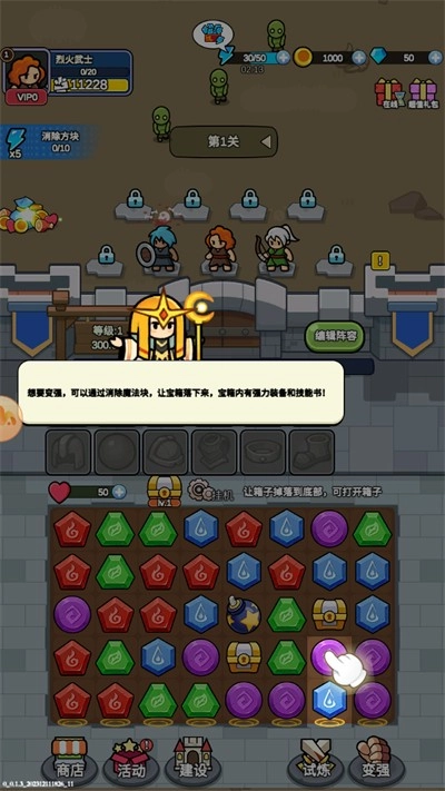 4、通过消除的方式可以获得各类装备和道具,从而让角色获得更多的道具属性加成,从而轻松击败更多的敌人。