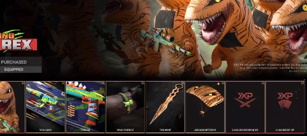 4、恐龙主题的捆绑包等待玩家获得,恐龙角色形象、武器等,还有经验等奖励。