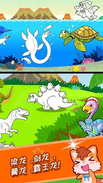 1、海量底图可供随意涂色绘画,图案丰富多样,涵盖各种各样的恐龙,让人久玩不厌;
