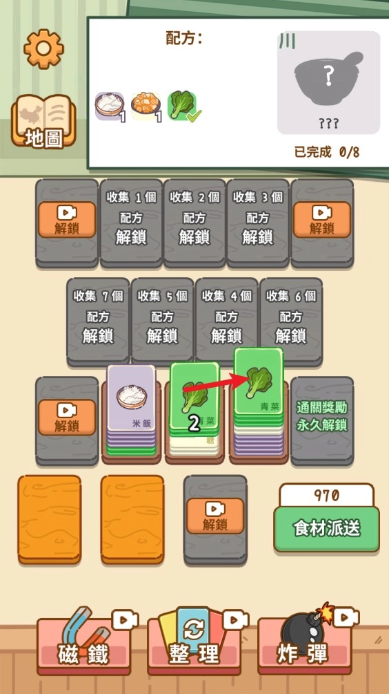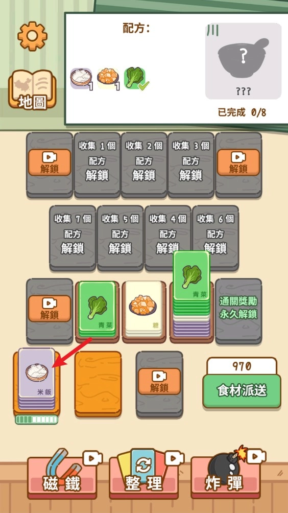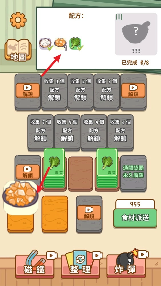 3、所有的食材都可以直接移动到下方的案板上,但是后续就无法移动,除非凑齐到10个合成出食材。