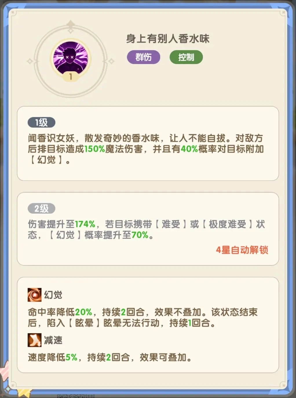 “幻觉”不仅降低敌方命中率,结束后还能使目标陷入眩晕,是关键时刻的绝佳控制技能。