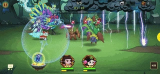 这段动图里,彩翎宝雀和吉祥宝鲤一同出战,目的是测试战斗法宝戮魂幡对吉祥宝鲤的加成效果。