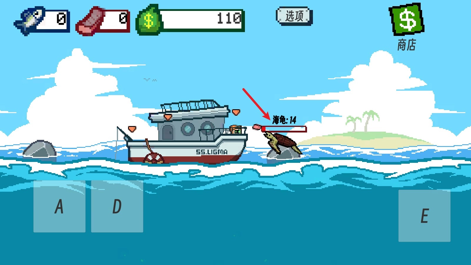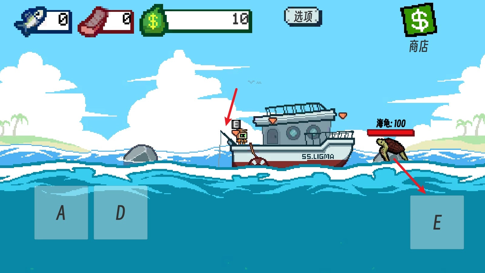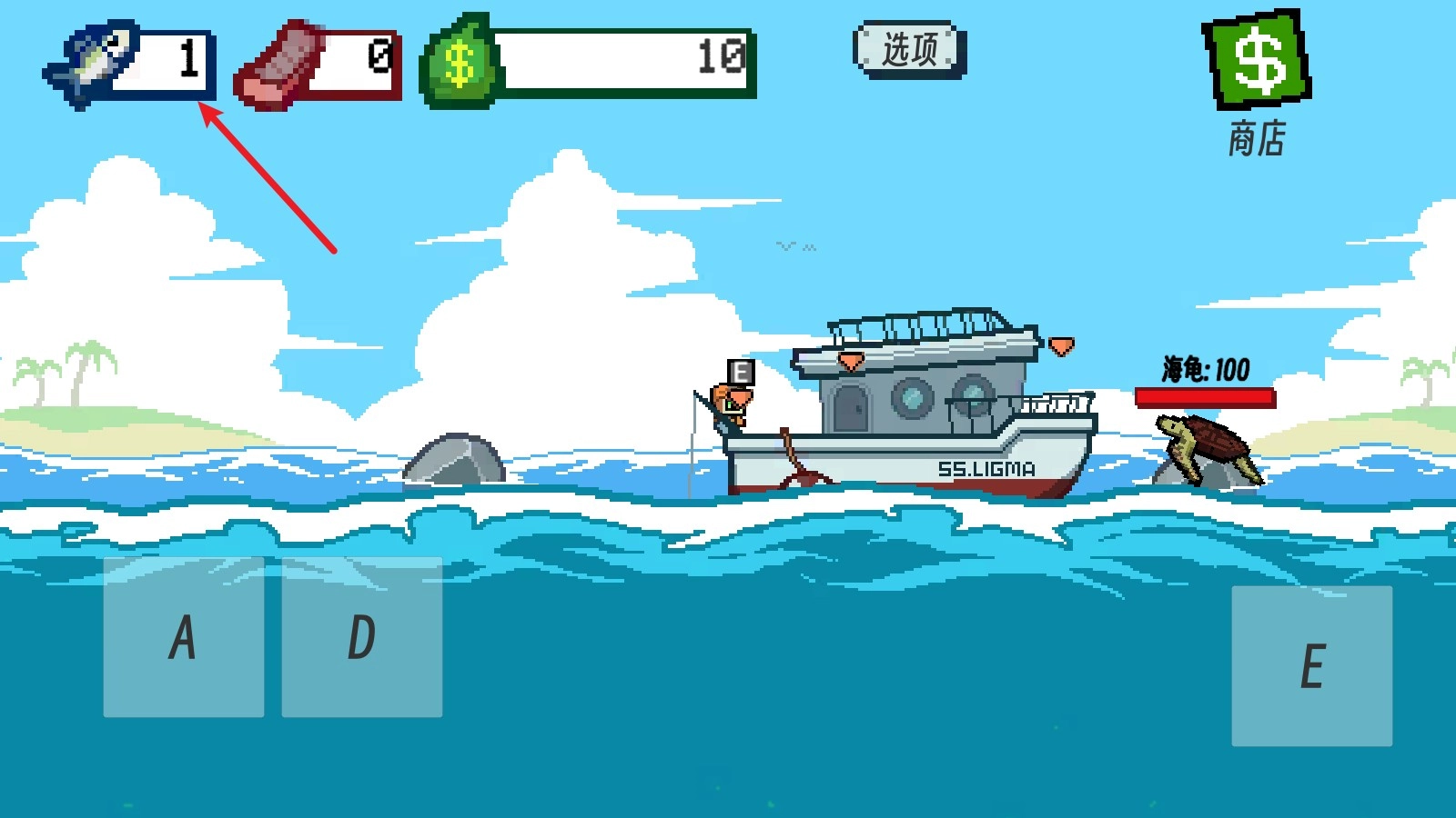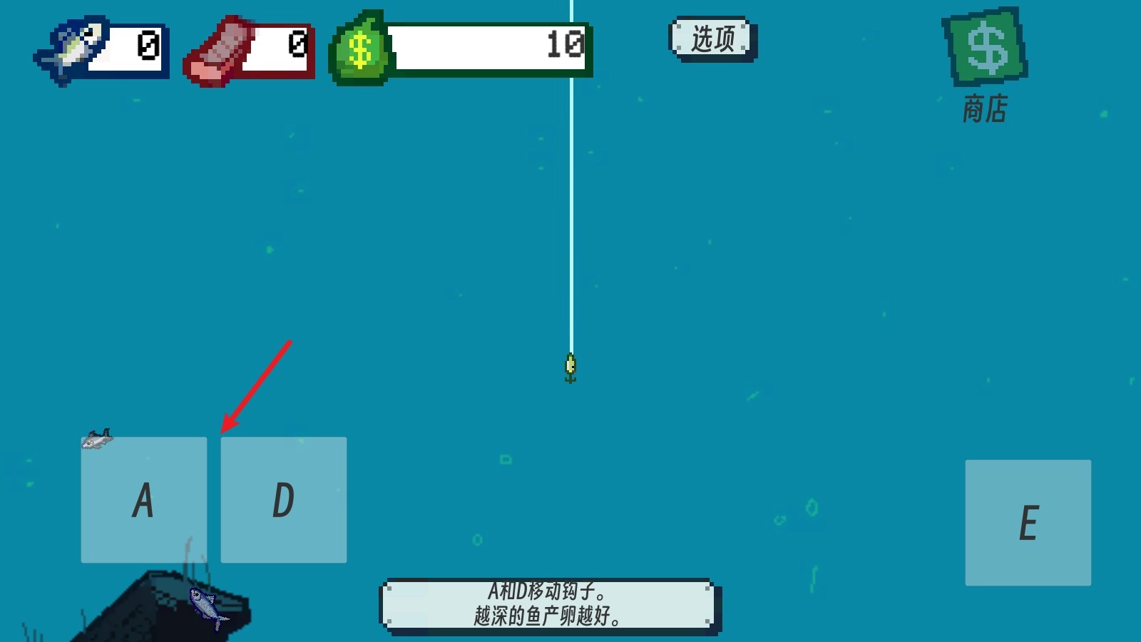 2、我们通过A、D键可以控制鱼钩钓鱼,越深的位置,鱼的质量越好。