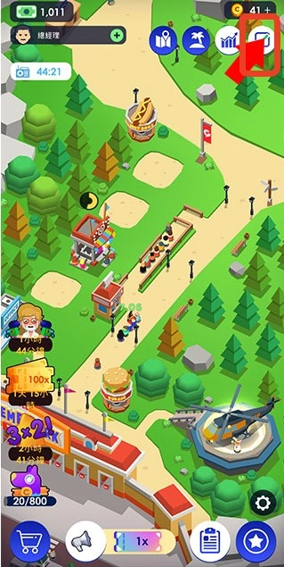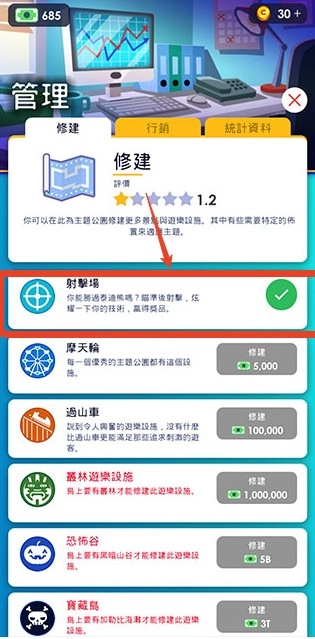 4、当资金充足时,玩家可在管理页面的修建选项中增设更多游乐设施。