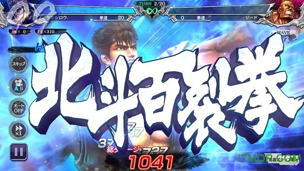 玩法十分爽快,玩家只需看准时机点击屏幕施展连续技就能攻击敌人,攻击过程中会像原作《北斗神拳》那样,出现主角“拳四郎”发动秘孔攻击时的配音。释放奥义时会通过CG动画来还原,还会用动态特效来展现战斗场景。