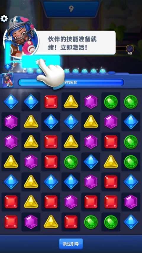 每一位角色都有技能,对应颜色的宝石可以积攒角色的能量,当能量槽满后,即可释放角色技能。不过要注意的是,能量槽满后若是不释放,再消除自己对应颜色宝石是不会积攒能量的。