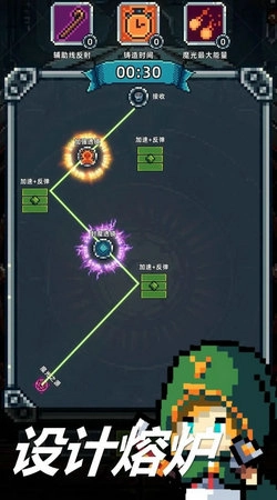 玩法是轻度单机休闲,沙盒的规则设计很好,场内物件自由摆放,利用光的折射,尽可能多收集魔能满足顾客需要。完成委托可以获得金币奖励,从而在布局阶段购买道具,加强输出或解锁新能源项目,有资源统筹策略。引导内容不多,但规则简单易懂,上手很容易。