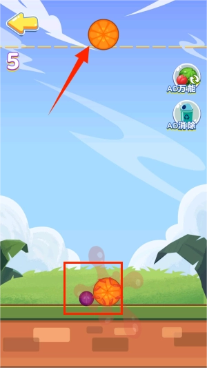 3、上方横线上是水果,点击它可以控制它掉落,如果两个一样的水果就可以合成新的更高级的水果。
