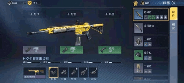 在中,配件是主武器专用的强化道具,主武器可以装备六个配件,而六个配件又会为主武器提升不同的数值。比如枪械握把会提升武器的防具穿透能力,而枪托则会增加技能强度。