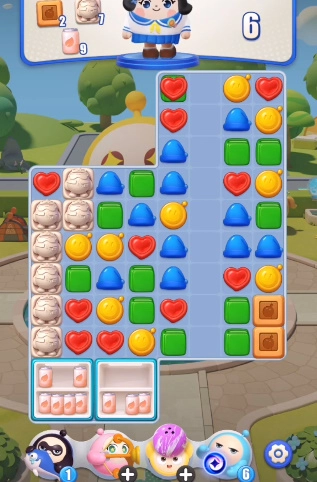 2、三消的风格和玩法,整体采用了蛋仔的题材和角色,同时搭配技能等方式来展开益智消除闯关。