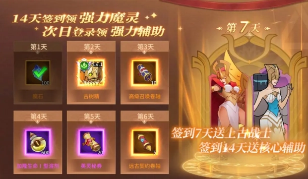 连续登录,每天都能领取不同的奖励,包括上古召唤卷轴、上古魔灵等。