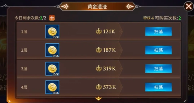 随着契约者们拯救大陆的脚步,当契约者们通关120关后,即可开启遗迹副本,每日通关黄金遗迹副本可获得大量金币奖励,金币副本的等级也会随之契约者的战力进行提升,战力越高副本奖励越丰富