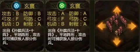 阵形:锥形阵(1阶)、偃月阵(1阶)、鹤翼阵(1阶)、鱼丽阵(1阶)