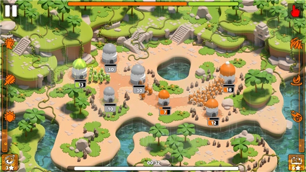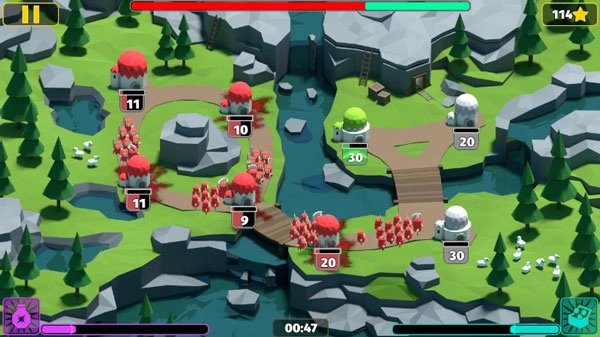 玩法:整体而言,上手难度不高,只需选择城堡并选定进攻目标就行,过程中可以多选,士兵会不断从城堡出发直到到达指定位置,另外左下方的能量还能用来给士兵加速、提升攻击和防御能力。