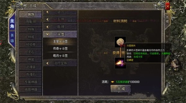 玩家若想合成高级斗笠,可借助合成功能逐步进行。初始斗笠需10个斗笠碎片合成,而其他高阶斗笠,都能通过2个同等级斗笠合成更高一级的斗笠。每个等级的斗笠合成,都需要消耗10W元宝。玩家想要收集斗笠碎片,可以通过完成日常任务挑战获取任务宝箱,开启宝箱有一定概率得到;也可以参与行会魔神、天魔降临等活动,同样能获得一些斗笠碎片。