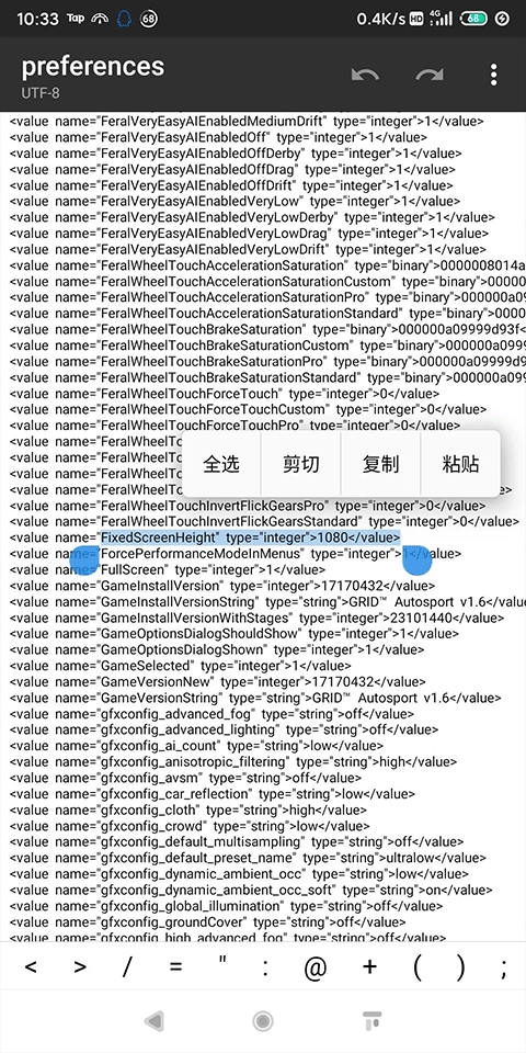 1、个mt管理器,不要root都可以改,找到这个路径:/Android/data/com.feralinteractive.gridas/files/feral__support/里的preferences文件。