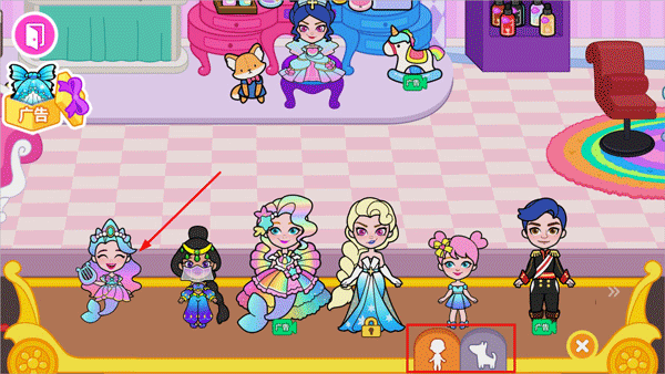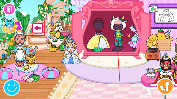 2、左右滑动可切换房间内的不同场景,还能调整公主的位置;点击衣柜中的衣服可为公主更换装扮,左上角的箭头则能切换至其他场景。