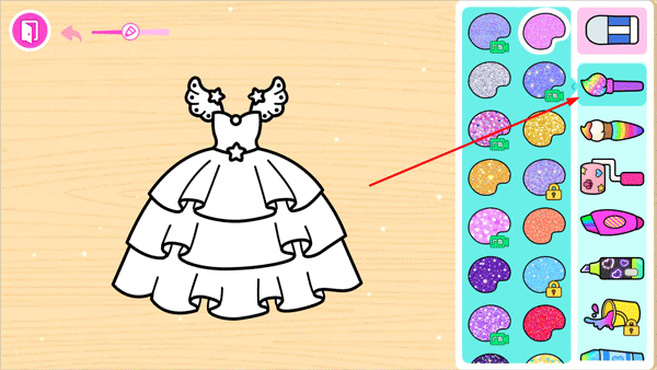 3、点击画框所在位置,即可开启新裙子的制作功能,界面右侧配备有用于给裙子上色的画笔与颜料。