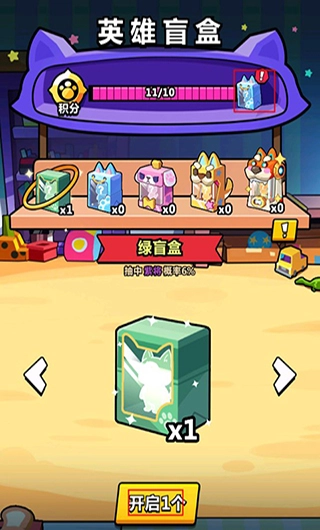 2、在击败BOSS后可以获得英雄盲盒,开启有几率获得英雄,盲盒有五个等级,等级越高英雄开出几率就越高,通过开启盲盒可以积累积分,获得额外的盲盒奖励。