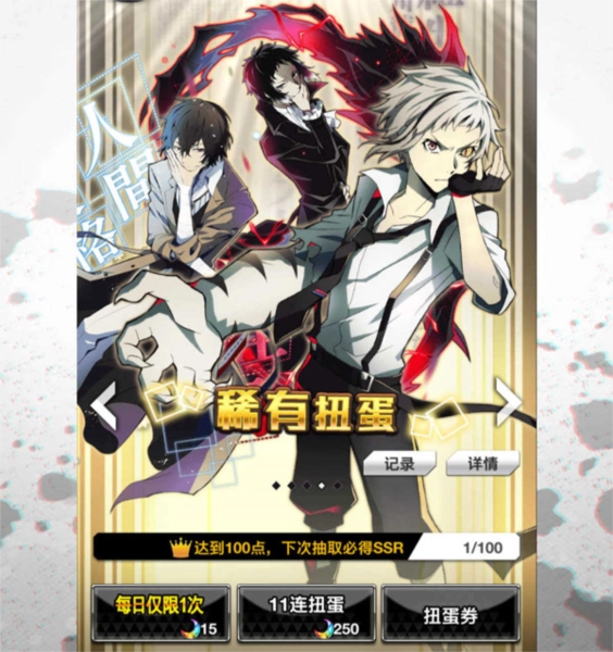 普通的卡池不建议在有活动的时候抽取,但是普通卡池每天第一次单抽会有优惠,只需要15异能石,也是非常划算的,如果有多余的异能石或者参加完活动卡池每天可以单抽一次普通卡池,我们在各种活动中获得的普通扭蛋券只能在普通卡池使用,所以可以直接使用,每一个卡池抽取100次还没有获得SSR的话下一次抽取都会必定获得一张SSR的保底卡。