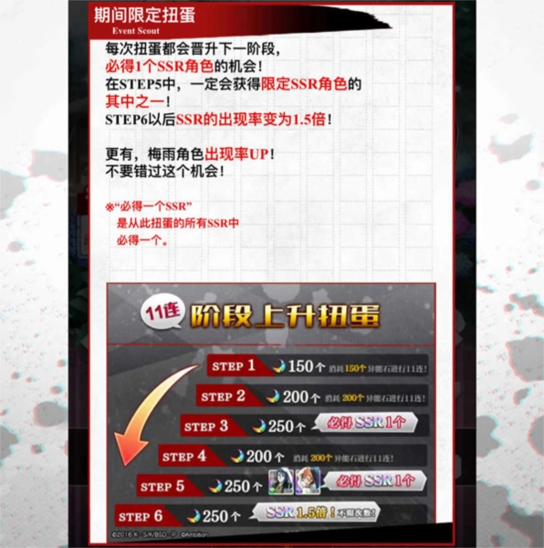 在此之后我们就可以抽活动卡池了,十连抽正常需要250异能石抽取一次,活动卡池一般都是阶段性的,一共分为六个阶段,第一阶段只需要150异能石,第二个阶段需要200异能石,第三个阶段需要250异能石,但是会必得一个SSR卡,第四个阶段重新降回200异能石,第五个阶段需要250异能石,但是会必得一张SSR的活动角色卡,到了第六个阶段以后需要250异能石,但是抽取SSR的几率会提升至1.5倍,而且不限抽取次数。