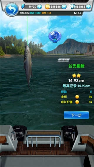 4、鱼上钩的时候注意控制卷线轮的进度条,长按右边的按钮控制力度将于拉回,当鱼往渔船方向游的时候按住按钮往上滑动,鱼就上钩啦。
