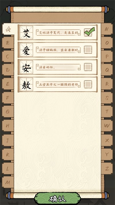 2、点击方框后进入姓氏选择界面,在这里可以寻找自己的姓氏进行发展;