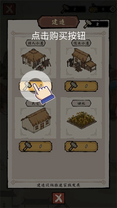 14、可以在里面选择不同的房屋进行打造,打造会消耗相应的锤子,玩家只要成功通关即可获得锤子,从而快速发展自己的家族。