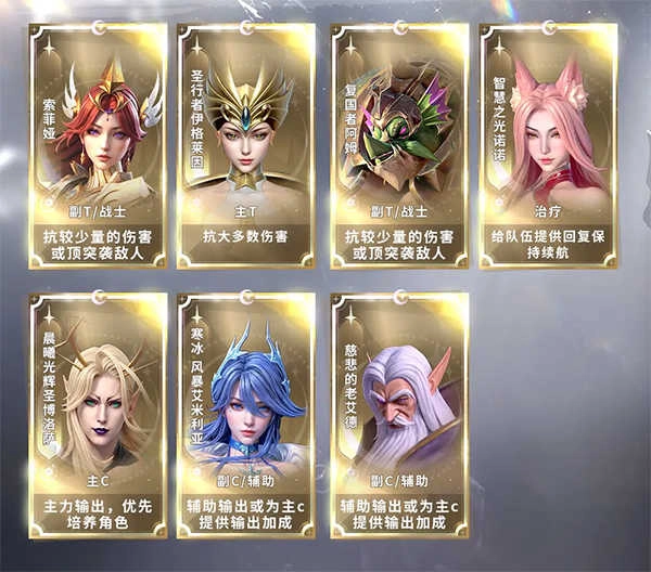 该阵容中的精英伙伴和阿努比斯是前期送的,中途抽到定位相同的伙伴可以直接替换。晨曦光辉圣博洛萨作为少有的远程单点输出,属于主C的最佳人选之一,一些前排较肉的关卡可以比较轻松突破。副C的位置可以用其他类似的输出替换,例如慈悲的老艾德、风语者凯兰崔尔等。